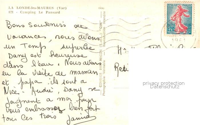 13638296 La Londe-les-Maures Camping le Pansard postalisch gelaufen Erhaltung siehe scans [FriedD77] carte postale Frie Katcode 11170083283071
