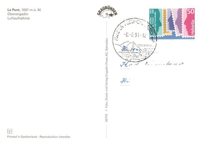 13882469 alte Postkarte La Punt-Chamues-ch Fliegeraufnahme postalisch gelaufen Erhaltung siehe scans [WerneD78] KatCode: 11470100335216