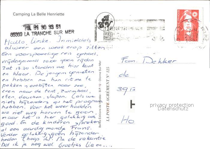 12034370 carte postale La Tranche-sur-Mer Camping La Belle Henriette postalisch gelaufen Erhaltung siehe scans KatCode: 11170085385294