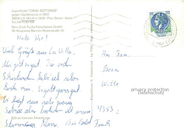 74142050 old postcard La Villa Val Badia Gadertal Suedtirol IT Jugendhotel Ciasa Sottsass postalisch gelaufen Erhaltung siehe scans [WerneD78] KatCode: 11240