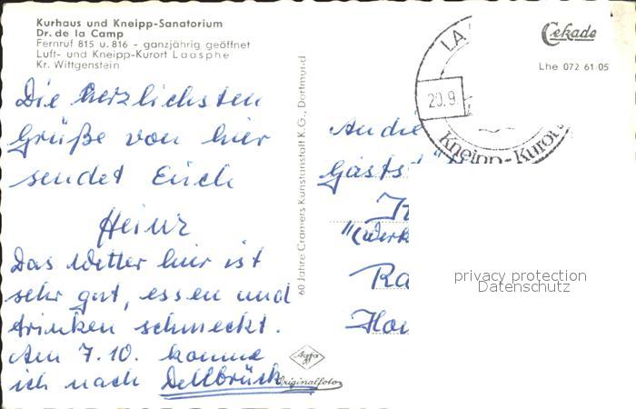 72278493 alte Postkarte Laasphe Bad Kurhaus Sanatorium Dr. del al Camp postalisch gelaufen Erhaltung siehe scans KatCode: 11110005970028