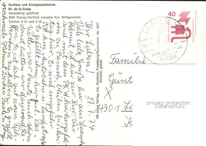 72450638 alte Postkarte Laasphe BAD LAASPHE NRW Bahnhofstrasse Kurklinik Emmaburg Schloss Wittgenstein An der Lahn Freibad postalisch gelaufen Erhaltung siehe scans KatCode: 11110005970028