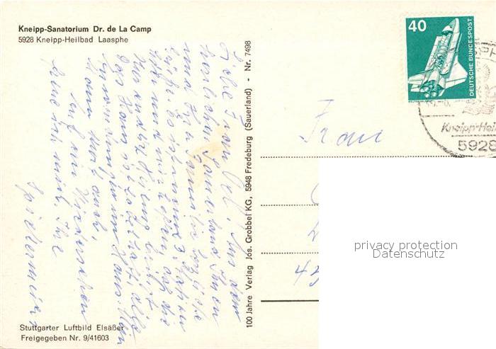 73106506 alte Postkarte Laasphe BAD LAASPHE NRW Fliegeraufnahme Kneippsanatorium de La Camp postalisch gelaufen Erhaltung siehe scans [KathaD81] KatCode: 11110005970028