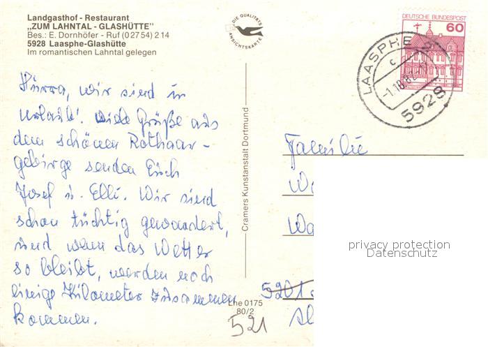 73109216 alte Postkarte Laasphe BAD LAASPHE NRW Glashuette Zum Lahntal Landgasthof Restaurant postalisch gelaufen Erhaltung siehe scans [KathaD81] KatCode: 11110005970028