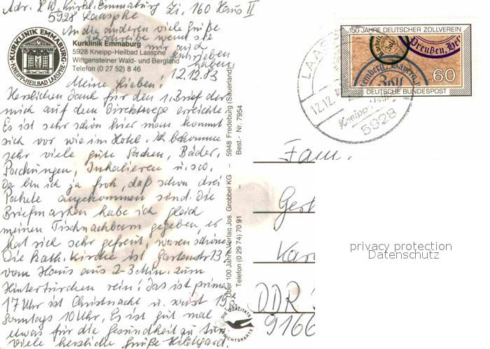 72640420 alte Postkarte Laasphe BAD LAASPHE NRW Kurklinik Emmaburg Hallenbad Kneipp Heilbad postalisch gelaufen Erhaltung siehe scans [FriedD77] KatCode: 11110005970028