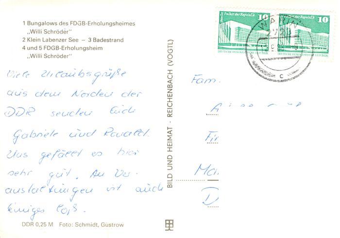 73901575 alte Postkarte Labenz Bungalows des FDGB Erholungsheimes Wille Schroeder Klein Labenzer See Badestrand und FDGB Erholungsheim Willi Schroeder postalisch gelaufen Erhaltung siehe scans [WerneD78] KatCode: 11110001053079