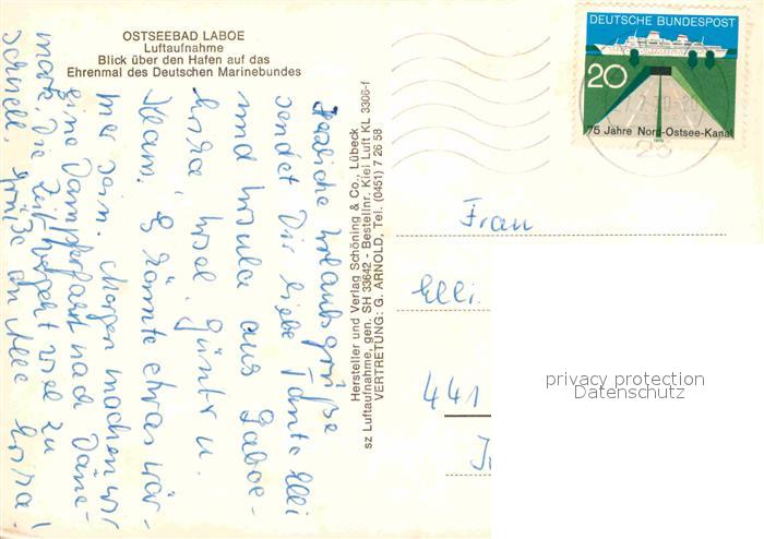 72742920 alte Postkarte Laboe Fliegeraufnahme mit Hafen Ehrenmal des Deutschen Marinebundes postalisch gelaufen Erhaltung siehe scans [LiesaD40] KatCode: 11110001057043