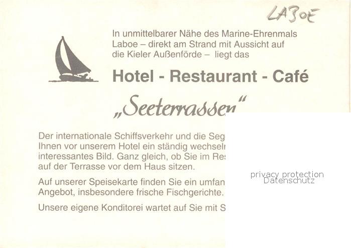 73108098 Laboe Hotel Restaurant Cafe Seeterrassen postalisch nicht gelaufen Werbekarte (keine Postkarte) Erhaltung siehe scans [KathaD81] KatCode: 11110001057043