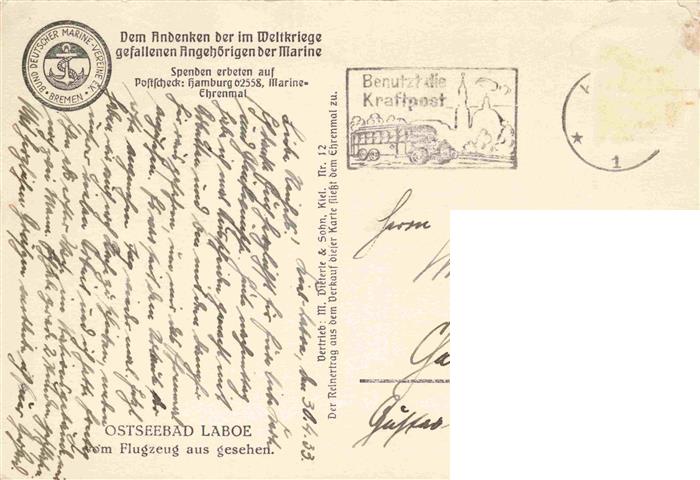 73973244 alte Postkarte LABOE Ostseebad Fliegeraufnahme mit Marine Ehrenmal postalisch gelaufen Erhaltung siehe scans [WerneD78] KatCode: 11110001057043
