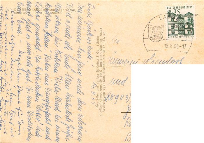 73942181 alte Postkarte Laboe Ostseebad mit Marine-Ehrenmal postalisch gelaufen Fliegeraufnahme Erhaltung siehe scans [FriedD77] KatCode: 11110001057043