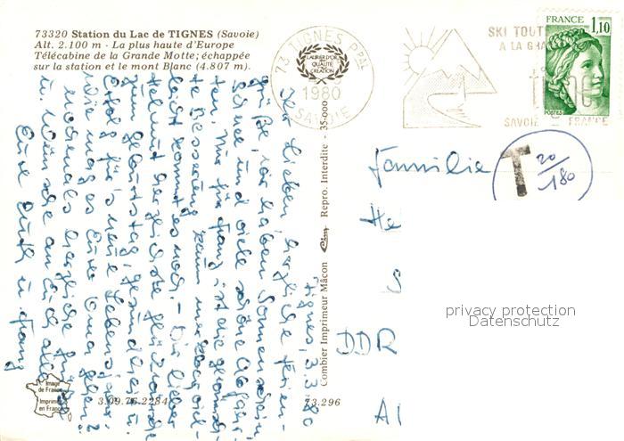 13477885 carte postale Lac de Tignes Télécabine de la Grande Motte Mont Blanc Sport d hiver Alpes francaises postalisch gelaufen Erhaltung siehe scans [FriedD77] KatCode: 11170073173296