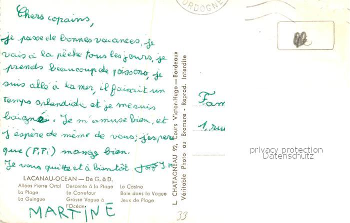 13504527 carte postale Lacanau Allees Pierre Ortal La Plage La Guingue Grosse Vague a l’Ocean Le Casino Bain dans la Vogue Jeux de Plage postalisch gelaufen Erhaltung siehe scans [WerneD78] KatCode: 11170033233214