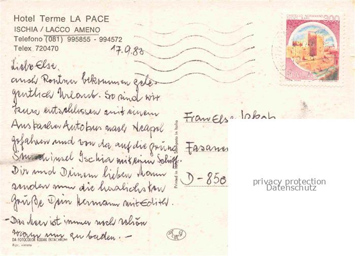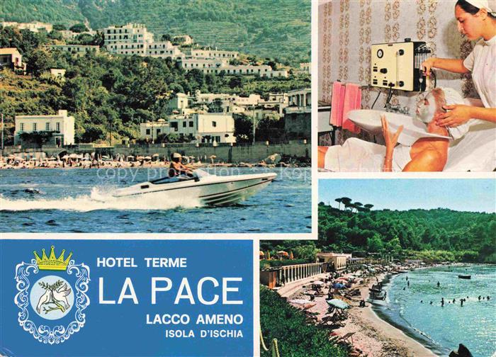 74148778 old postcard Lacco Ameno ISCHIA Isla Napoli Campania IT Ansicht vom Meer aus Motorboot Hotel Terme La Pace Strand postalisch gelaufen Erhaltung siehe scans [FriedD77] KatCode: 11240