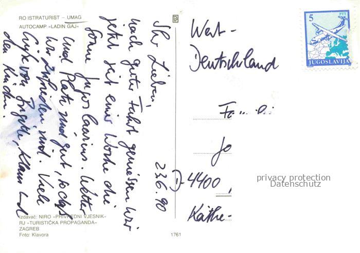 74142151 old postcard Ladin Gaj (Camping) Umag Umago Umaga Istrien Croatia Autocamp postalisch gelaufen Erhaltung siehe scans [FriedD77] KatCode: 11260