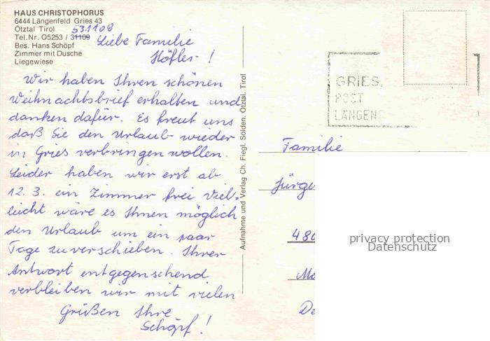 74104211 alte Postkarte Laengenfeld Imst oetztal Tirol AT Haus Christophorus postalisch gelaufen Erhaltung siehe scans [WerneD78] KatCode: 11390334070203