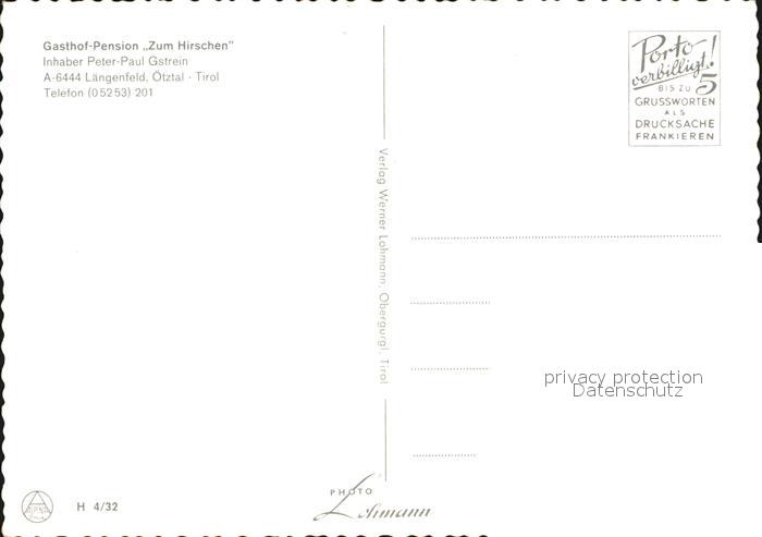 12572819 Laengenfeld Oetztal Gasthof Zum Hirschen postalisch nicht gelaufen Erhaltung siehe scans [NatalD47] KatCode: 11390334070208