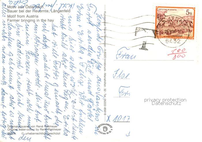 73161224 alte Postkarte Laengenfeld Oetztal Motiv aus oesterreich Bauer bei der Heuernte Kuenstlerkarte Original Aquarell Rene Rietmeyer postalisch gelaufen Erhaltung siehe scans [FriedD77] KatCode: 11390334070208
