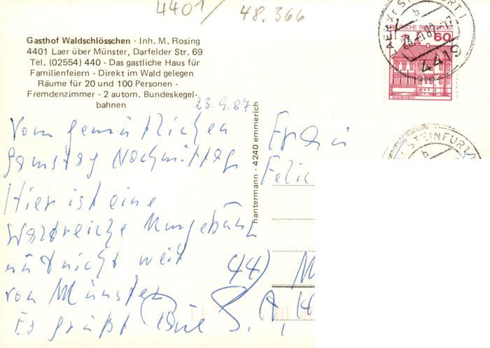73895092 alte Postkarte Laer Steinfurt Gasthof Waldschloesschen Gastraeume Bar Kegelbahn postalisch gelaufen Erhaltung siehe scans [WerneD78] KatCode: 11110005566036