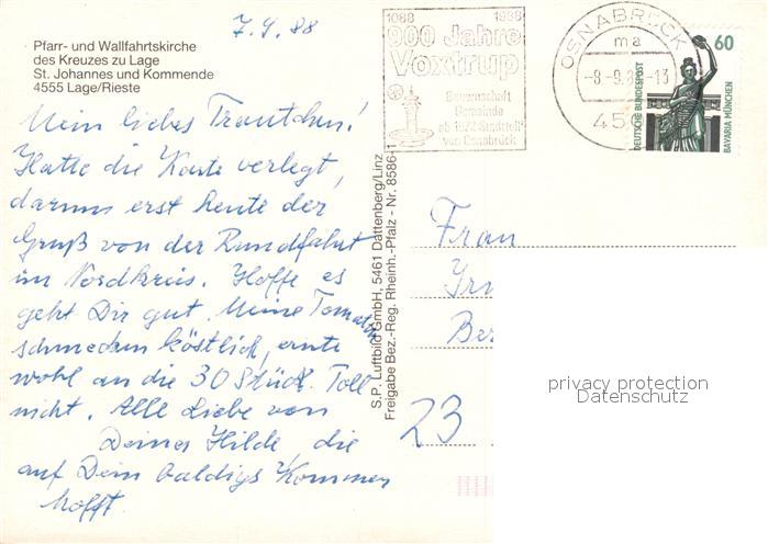 73040863 alte Postkarte Lage Rieste Pfarrkirche Wallfahrtskirche des Kreuzes zu Lage Fliegeraufnahme postalisch gelaufen Erhaltung siehe scans [FriedD77] KatCode: 11110003459031