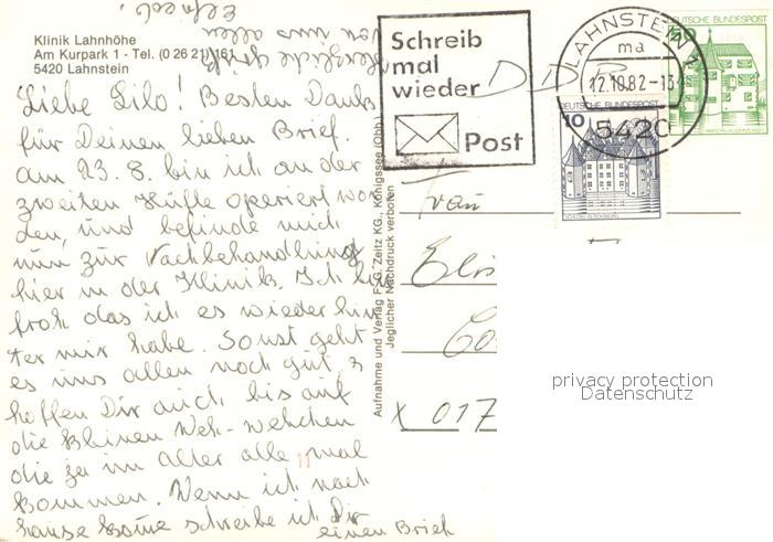 73716947 alte Postkarte Lahnstein Fliegeraufnahme Klinik Lahnhoehe Am Kurpark postalisch gelaufen Erhaltung siehe scans [LiesaD40] KatCode: 11110007141075
