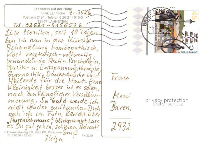 73106604 alte Postkarte Lahnstein Fliegeraufnahme Klinik Lahnhoehe postalisch gelaufen Erhaltung siehe scans [KathaD81] KatCode: 11110007141075