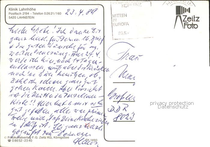 72309316 alte Postkarte Lahnstein Klinik Lahnhoehe postalisch gelaufen Erhaltung siehe scans KatCode: 11110007141075
