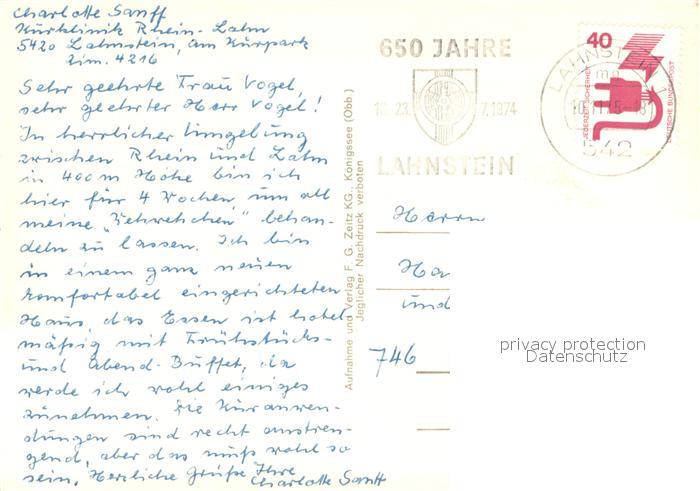 73711823 alte Postkarte Lahnstein Kurthermen Rhein-Lahn Hallen und Freibad Speisesaal postalisch gelaufen Erhaltung siehe scans [WerneD78] KatCode: 11110007141075