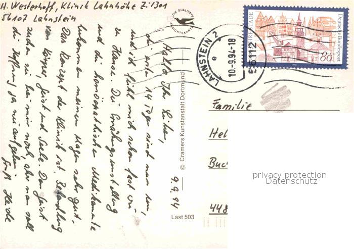 72760590 alte Postkarte Lahnstein Kurzentrum Kurpark Klinik-Lahnhoehe postalisch gelaufen Erhaltung siehe scans [LiesaD40] KatCode: 11110007141075