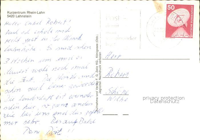 72064762 alte Postkarte Lahnstein Kurzentrum Rhein Lahn Fliegeraufnahme postalisch gelaufen Erhaltung siehe scans KatCode: 11110007141075