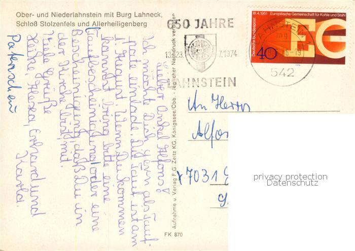 73785822 alte Postkarte Lahnstein Ober und Niederlahnstein mit Burg Lahneck Schloss Stolzenfels und Allerheiligenberg Fliegeraufnahme postalisch gelaufen Erhaltung siehe scans [WerneD78] KatCode: 11110007141075