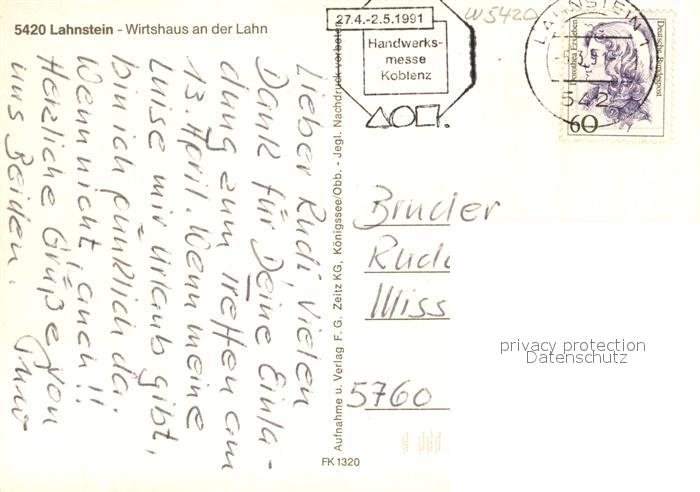 73164423 alte Postkarte Lahnstein Wirtshaus an der Lahn postalisch gelaufen Erhaltung siehe scans [WerneD78] KatCode: 11110007141075