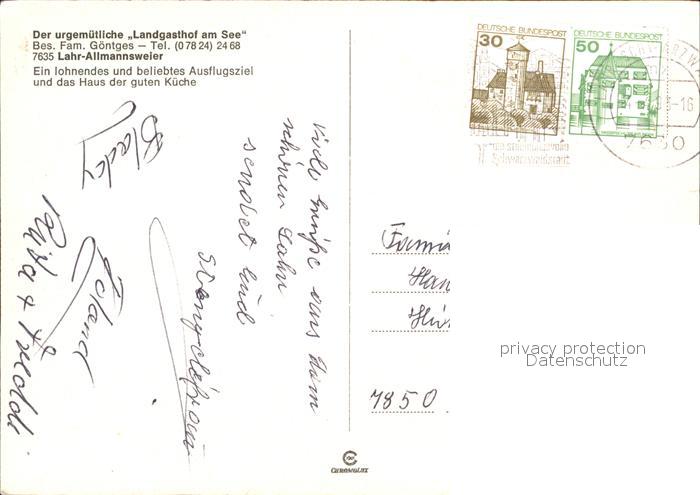 72583424 alte Postkarte Lahr Schwarzwald Allmanssweier Landgasthof am See postalisch gelaufen Erhaltung siehe scans [LiesaD40] KatCode: 11110008317065