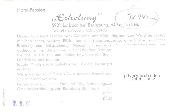 74056047 Laibach Bad Berleburg NRW Hotel Pension Erholung Speiseraum Sitzecke Landschaftspanorama Goldeiche postalisch nicht gelaufen Werbekarte (keine Postkarte) Erhaltung siehe scans [FriedD77] KatCode: 11110005970004