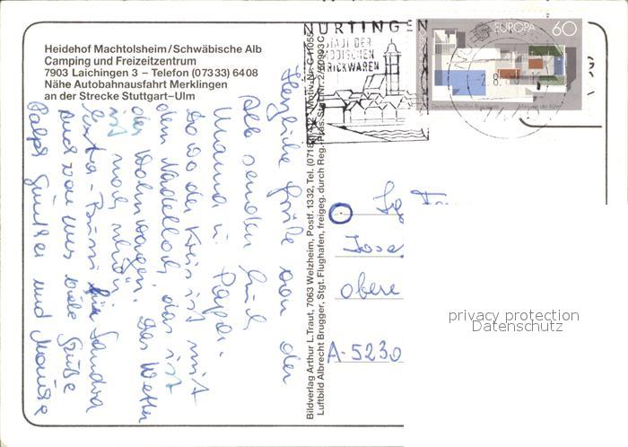 72504422 alte Postkarte Laichingen Camping Machtolsheim Fliegeraufnahme postalisch gelaufen Erhaltung siehe scans KatCode: 11110008425071