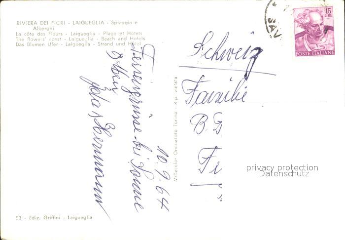 alte Postkarte Laigueglia Alberghi Spiaggia Riviera dei Fiori postalisch gelaufen Erhaltung siehe scans