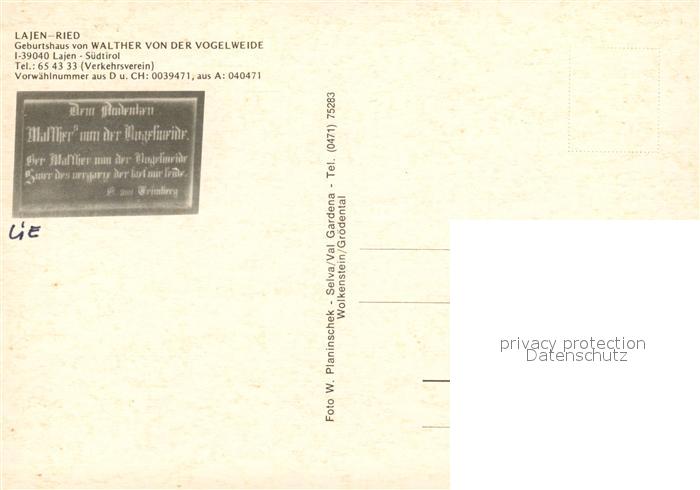 73305370 Lajen Groednertal Suedtirol Geburtshaus von Walther von der Vogelweide postalisch nicht gelaufen Erhaltung siehe scans [WerneD78] KatCode: 11390