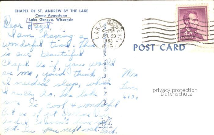 72342183 old postcard Lake Geneva Wisconsin Chapel of St. Andrew by the Lake postalisch gelaufen Erhaltung siehe scans KatCode: 14140520000000