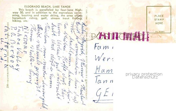72614749 old postcard Lake Tahoe California Eldorado Beach postalisch gelaufen Erhaltung siehe scans [WerneD78] KatCode: 14140050000000