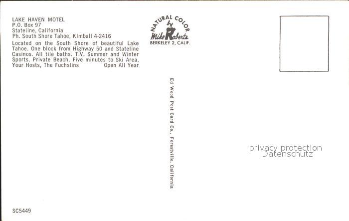 71953281 Lake Tahoe California Lake Haven Motel Stateline postalisch nicht gelaufen Erhaltung siehe scans KatCode: 14140050000000