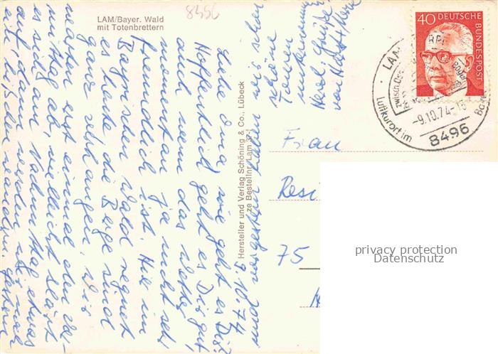 74049210 alte Postkarte Lam Oberpfalz Ortsansicht mit Kirche Totenbretter postalisch gelaufen Erhaltung siehe scans [FriedD77] KatCode: 11110009372138