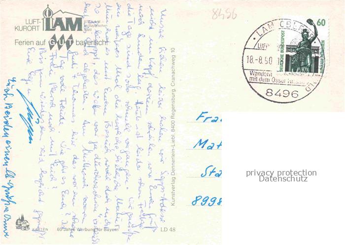74049209 alte Postkarte Lam Oberpfalz Panorama Luftkurort Bayerischer Wald Freibad Marktplatz Kirche postalisch gelaufen Erhaltung siehe scans [FriedD77] KatCode: 11110009372138