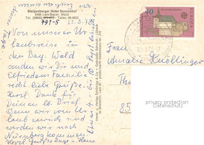 73774730 alte Postkarte Lam Oberpfalz Steigenberger Hotel Sonnenhof Ferienapartment Hotelhalle Cocktail Lounge Petrusstube Hotelrestaurant postalisch gelaufen Erhaltung siehe scans [WerneD78] KatCode: 11110009372138