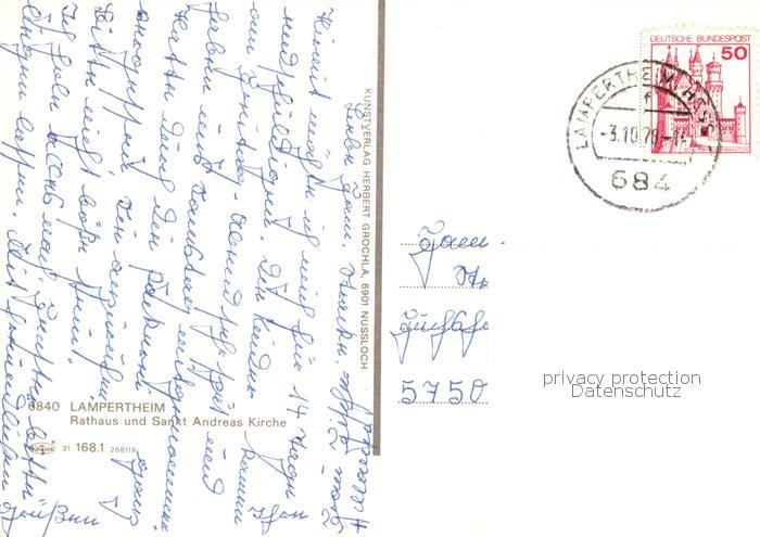 73834149 alte Postkarte Lampertheim Bergstrasse Rathaus und St Andreas Kirche postalisch gelaufen Erhaltung siehe scans [FriedD77] KatCode: 11110006431013