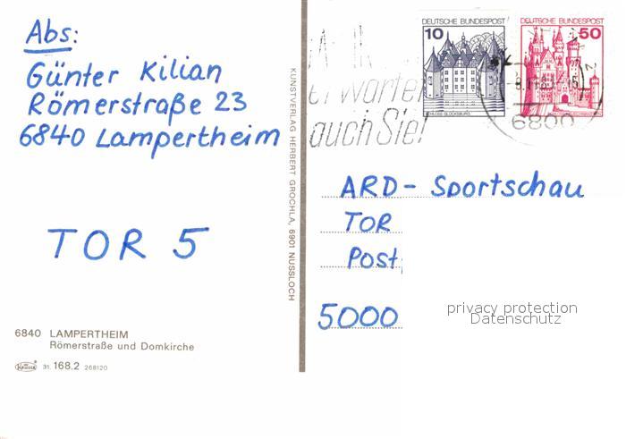 72724815 alte Postkarte Lampertheim Bergstrasse Roemerstrasse und Domkirche postalisch gelaufen Erhaltung siehe scans [FriedD77] KatCode: 11110006431013