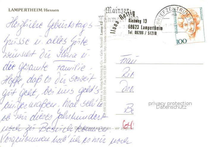 73258529 alte Postkarte Lampertheim Bergstrasse Schillerplatz Altrhein Roemerstrasse St Andreas Rathaus postalisch gelaufen Erhaltung siehe scans [WerneD78] KatCode: 11110006431013