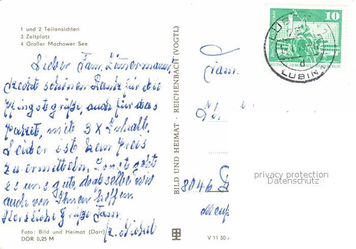 72632378 alte Postkarte Lamsfeld-Gross Liebitz Teilansichten Zeltplatz Badestrand Grosser Mochower See postalisch gelaufen Erhaltung siehe scans [FriedD77] KatCode: 11110012061450