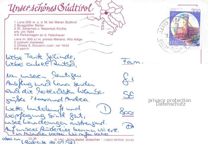 74079669 old postcard Lana di Sotto Niederlana Lana Meran IT Panorama Burggraefler Reiter St Johannes von Nepomuk Kirche Parkanlagen Costumi meranesi Chiesa San Giovanni postalisch gelaufen Erhaltung siehe scans [WerneD78] KatCode: 11240