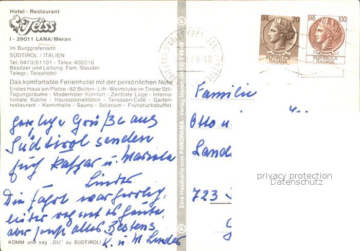 old postcard Lana Meran Hotel Teiss postalisch gelaufen Erhaltung siehe scans
