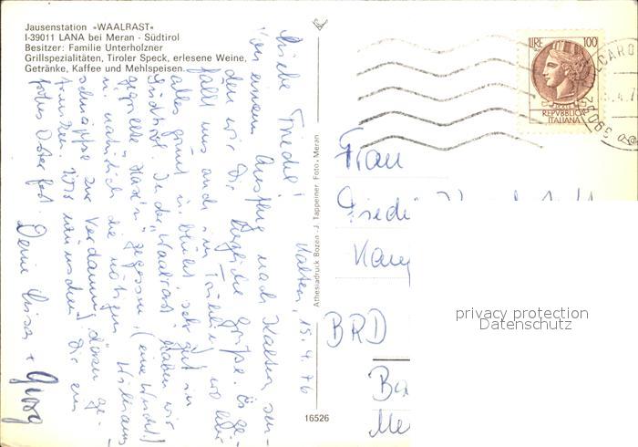 old postcard Lana Meran Jausenstation Waalrast postalisch gelaufen Erhaltung siehe scans