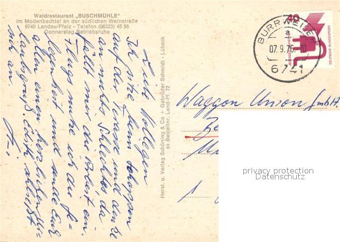 73125321 alte Postkarte Landau Pfalz Waldrestaurant Buschmuehle postalisch gelaufen Erhaltung siehe scans [NatalD47] KatCode: 11110007313000